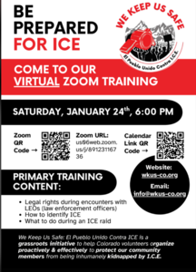 This training is virtual only and presented by We Keep Us Safe: El Pueblo Unido Contra ICE. We Keep Us Safe is a grassroots initiative to help the metro Denver area organize proactively and effectively to protect our community members from being illegally and inhumanely kidnapped by ICE. We are developing a hub of resources and best practices targeted towards the Denver area, but many of the resources are statewide. We are educating and activating community members through canvassing, training, and outreach. Our goal is to support interested volunteers across the Metro Denver area in building community and solidarity–and to support volunteers in effectively self-organizing in the face of state violence."