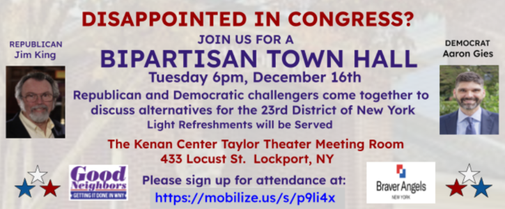 Braver Angels joins Good Neighbors Getting it Done in WNY to moderate a thoughtful and civil discussion. Find out how Jim and Aaron would each approach the job of Congressman. Ask them about their views on issues important to you. Learn how you might be able to help improve how we are governed.