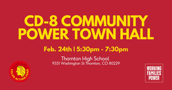 "COLOR Action Fund and Colorado Working Families Power invite you to a Congressional District 8 Community Power Town Hall with Democratic congressional candidates Manny Rutinel (confirmed), Evan Munsing (confirmed), and Shannon Bird (invited).