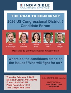 Indivisible COS will be hosting a forum for CD5 candidates. ALL candidates have been invited.