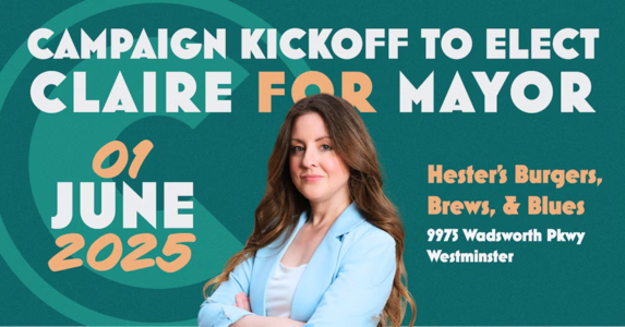 Join Claire on June 1st for her official Campaign Kickoff. Come meet neighbors, hear Claire’s vision for Westminster, and learn how you can be part of building a city that works for everyone. Whether you’re ready to volunteer, donate, or just want to learn more—this is where it starts.
