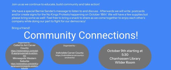 We have a special Bernie Sander’s message to listen to and discuss. Afterwards we will write postcards and/or create signs for the No Kings Protests happening on October 18th! We will have a few supplies but please bring some as well! Feel free to bring a snack to share as we come together to enjoy each other’s company while doing our part to fight for our democracy!
