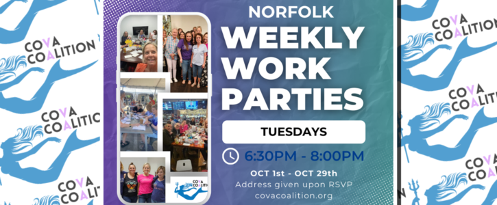 Join COVA Coalition for weekly work parties in Norfolk! We will be working on a multitude of things including, but not limited to, postcard writing, text banks, phone banks, packet building for down ballot races, and putting together signs.