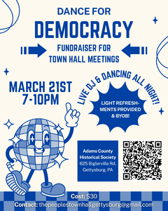 The People's Town Hall Committee of Gettysburg invites you to join us for a fun in-person bash where moves meet voices for change! Come join the fun with our live DJ, light refreshment (feel free to BYOB), and a chance to celebrate freedom, unity, and democracy through a great night of music. We are raising funds for two Town Halls in 2026, so there is a modest fee of $30. You can pay at the door, or scan the QR code on the image above.