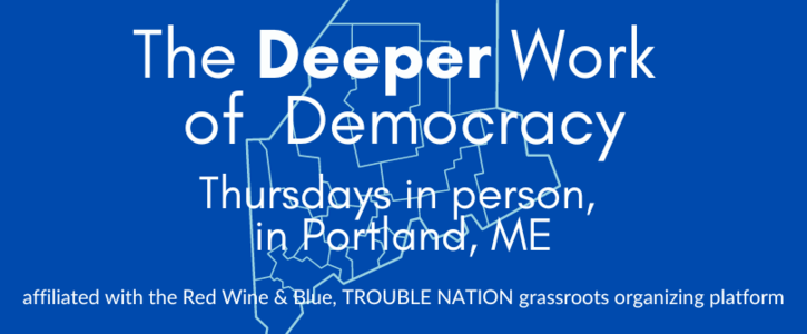 Leah, however, is hosting an in person group weekly on Thursdays for *Doing the Deeper Work of Democracy*, educating ourselves, overcoming our shortsightedness, making sense of the complex history fueling the breaking news, improving our leadership skills for sustaining real coalitions, and building the muscles of democracy in ourselves and our relationships.