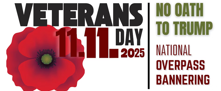 Across the nation, teams will hold visibility events on overpasses and bridges. Millions of people will see the messages! The purpose of this national event is to give Veterans a platform to express their outrage with the Trump administration's steamrolling of our Constitution and rules of law. Veterans, as well as all public servants who swear an oath to the Constitution, are tired of the administration thinking military service members make oaths to the president!