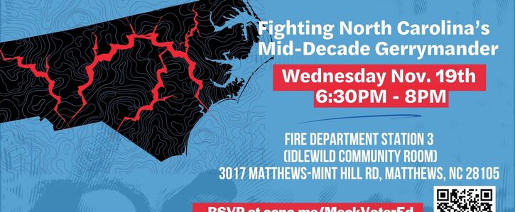 Join East Meck Hornets' Nest and Common Cause NC for a special voter education training on Wednesday, November 19, from 6:30 pm to 8 pm in Matthews to learn more about redistricting, the impacts of gerrymandering on our communities and recent voting and election changes. Visit https://www.mobilize.us/commoncause/event/867771/ for details and registration. We will discuss the latest non-partisan information to help you and your communities navigate our state's increasingly complex elections landscape.