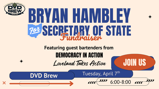 Join us for our Spring Social at DVD Brew! We'll be partnering with Democracy in Action (DIA) to raise funds for Bryan Hambley's campaign for Secretary of State. Kathryn & Kelly will be guest bartending with help from DIA members. All tips will be donated to Hambley's campaign.