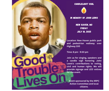 We’ll be coming together in [ New Haven MO] for a [Good Trouble Lives On Vigil ]. Join us for singing, speakers and a candle light vigil honoring John Lewis's contributions to Voting, Civil and Human Rights. We will provide signage and LED votives for the event. Join us as we make a little "good trouble"!
