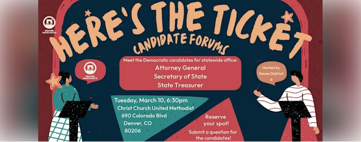 Here’s The Ticket is a candidate forum designed to help Democratic voters get to know the contenders for Colorado’s 2026 statewide races for Attorney General, State Treasurer, and Secretary of State. This is the second of this forum series being hosted House District 6!