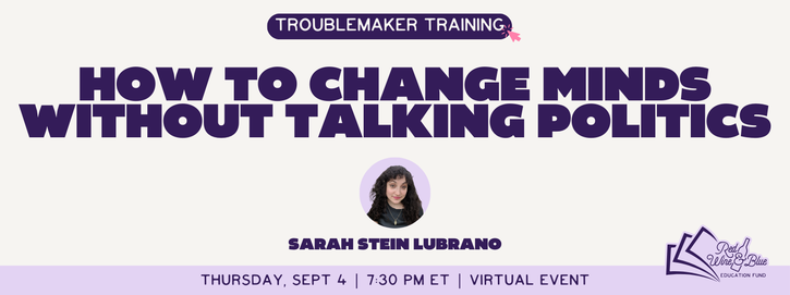 Join us to hear from Sarah Stein Lubrano, author of Don't Talk Politics, as she shares how to break through polarization, build trust, and turn everyday conversations into meaningful change. Learn why relationships, community building, and shared experiences are the best pathway to influencing and persuading others. It’s time to focus less on winning arguments and more on actually winning people over. You will leave this event with tools you can use right away to better connect with your friends, family, and community."