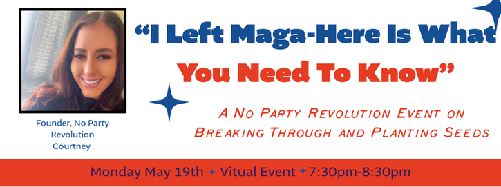 "You can’t argue someone out of a belief system they were emotionally recruited into but you can plant seeds. Join Courtney, former MAGA supporter and leader of the new No Party Revolution Troublenation grassroot group, for a powerful conversation about what makes MAGA messaging so effective and how to disrupt it without starting a fight. This Trouble Nation launch event isn’t about shame or blame. It’s about strategy. It’s about understanding the emotional grip of Trumpism, and how to interrupt it with truth, empathy, and strength. You’ll leave with practical tools, real language that works, and a sense of hope that real conversations can still break through. Because this isn’t about flipping someone overnight, it’s about starting a quiet revolution built on truth, respect, and courage"