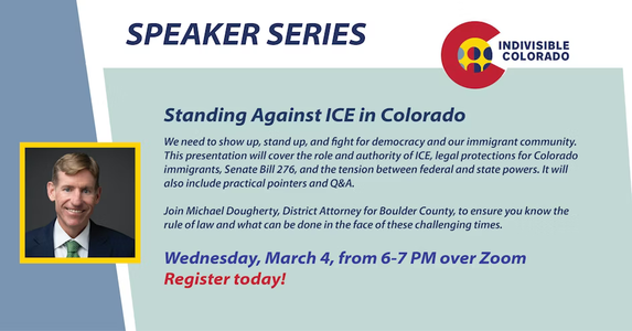 "Standing Against ICE in Colorado: Join us as we welcome DA for Boulder County, Michael Dougherty, who will speak about how we can protect our immigrant neighbors and understanding SB 276 as well as suggestions for what we can all do."
