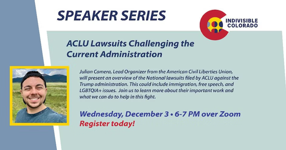 "Our December speaker is Julian Camera from the CO ACLU who will speak on current lawsuits against the current regime. join us for an enlightening presentation."