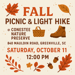 Join our friends at IUSC for a nature walk and picnic at Conestee Nature Preserve! Bring your favorite fall snacks, comfy shoes, and a cozy blanket for a laid-back picnic followed by a light hike (if you’re able) through the beautiful autumn trails.