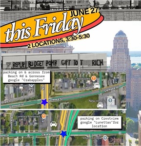 The WNY Overpass Bridge Brigade will hold a high-visibility protest on Friday June 27 from 3:30-5:30pm at two locations over I-90: the Genesee Street overpass and the Cleveland Drive overpass. Parking for the Genesee Street overpass is available on and across from Beach Road and Genesee Street by Crabapple’s. Parking for the Cleveland Drive overpass is available on Crestview by Lunetta’s. Contact [email protected] for more information.