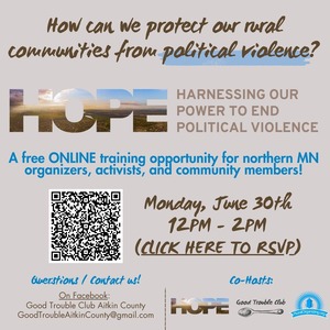 https://actionnetwork.org/events/harnessing-our-power-to-end-political-violence-hope-pv-online-training-for-rural-northern-mn-communities-2 TO REGISTER