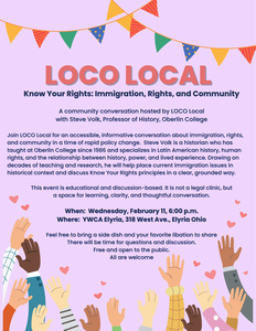 Join LOCO Local for an accessible, informative conversation about immigration, rights, and community in a time of rapid policy change. Steve Volk is a historian who has taught at Oberlin College since 1986 and specializes in Latin American history, human rights, and the relationship between history, power, and lived experience. Drawing on decades of teaching and research, he will help place current immigration issues in historical context and discuss Know Your Rights principles in a clear, grounded way.