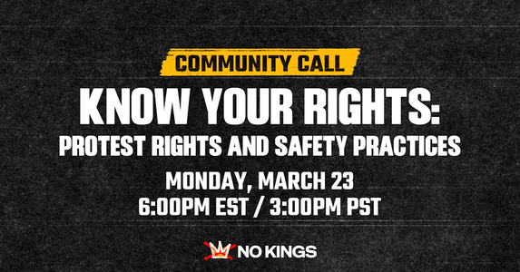 "In this ACLU-led training, participants will learn about the Constitutional right to peacefully protest and about best practices for reducing risks when attending protests like the upcoming No Kings mobilization on March 28.