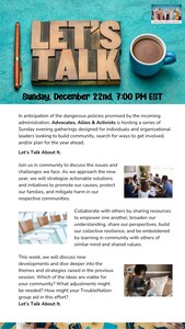 Let’s Talk About It is an opportunity to gather in community to learn, strategize, collaborate, and plan for tomorrow. So, collect your resources, write down your ideas, invite a like-minded friend, and join us for a substantive exchange in preparation for the new year.