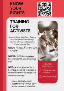 We have set up a Know Your Rights training for activists, both in person & Zoom, with a local public interest attorney next Monday.