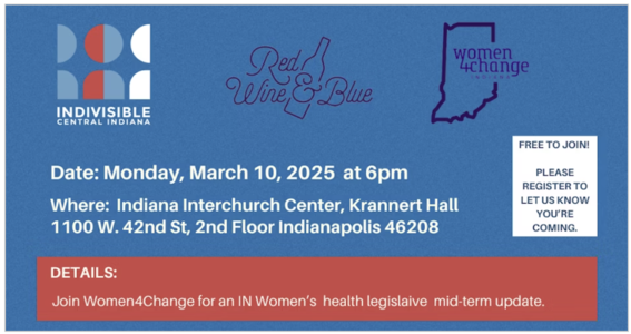 Join us as we advance the conversation on ways to get involved and womens health legislative landscape updates. This is a joint meeting of the minds for Hoosiers Voices for Liberty (RWB), Indivisible Central Indiana and Women4Change Indiana.