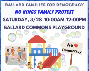 Join us for a No Kings Day family friendly protest & play date at Ballard Commons. Demonstrate our First Amendment rights while enjoying comaraderie, activites and music. Refreshments will be available.