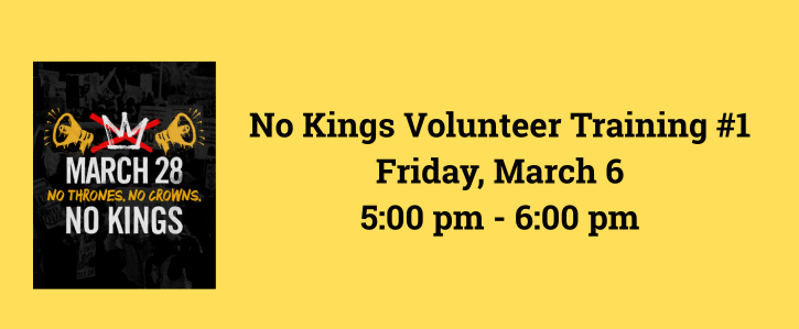 We also ask each volunteer to watch this training video provided by No Kings entitled "No Kings: Protest Safety, Know Your Rights, and Deescalation.