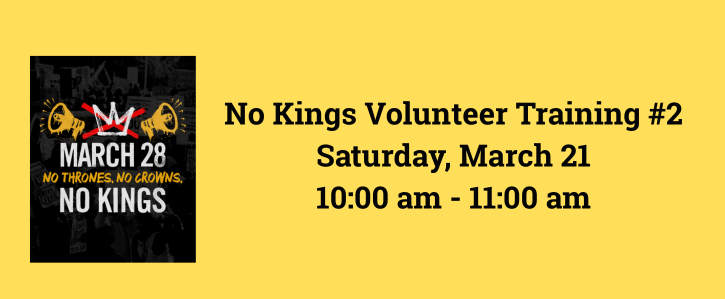 We also ask each volunteer to watch this training video provided by No Kings entitled "No Kings: Protest Safety, Know Your Rights, and Deescalation.
