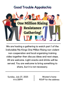 We are hosting a gathering to watch part 1 of the Indivisible/No Kings One Million Rising non-violent non-cooperation and local organizing training video together then discuss ideas and next steps. All are welcome. Light snacks and drinks will be served. You are welcome to bring something to share, but it is not necessary.