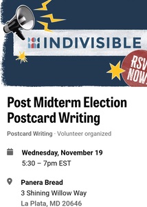 We have the postcards and the stamps. Stamp donations are always appreciated as er will we doing a ton of writing for next year's elections in swing states. Please register at this link: https://www.mobilize.us/indivisible/event/868671/
