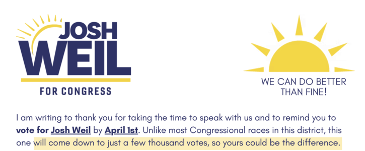 - I am writing to thank you for taking the time to speak with us and to remind you to vote for Josh Weil by April 1st. Unlike most Congressional races in this district, this one will come down to just a few thousand votes, so yours could be the difference. Josh is one of only a handful of people I would trust to do this job. He is not a career politician but a public school teacher and single father of two boys. This may be the last chance we get to elect him to represent the district in Washington, where he will stamp out corruption to lighten the burden on businesses and working people. Sincerely, ____ from ____