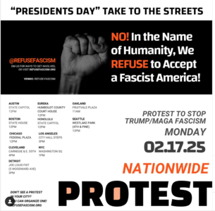Aligning with Refuse Fascism and #50501, we'll be protesting in Chicago at Federal Plaza at 12:00 p.m. on 2/17/25. It will be terribly cold, so wear your warmest, but please join us!