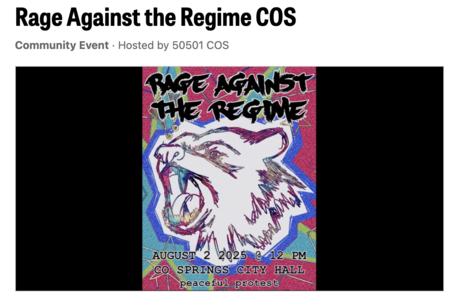 Colorado Springs City Hall at 12 pm! Rage Against the Regime is a powerful, peaceful protest and community gathering uniting people in opposition to the Trump administration and its ongoing threats to democracy, human rights, and the environment. This event is about standing up—loudly and clearly—for justice, truth, and equity.