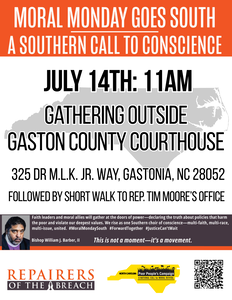 I'm helping organize Moral Mondays in NC at Congressional District offices across the state, and we're starting in your congressional district with Tim Moore this Monday, July 14th at 11am. Our plan is to gather at the Gastonia office. (I know there's an office in Cornelius, but we're going to try and connect at this office because it is more central for the whole district)