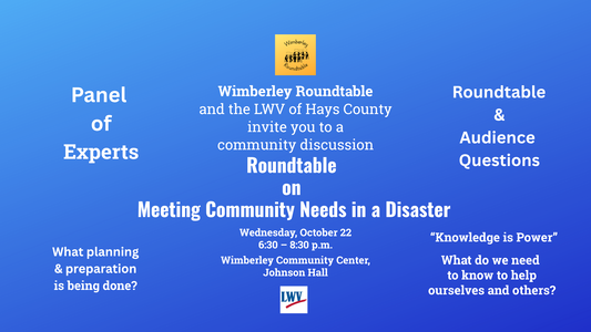 Sponsored by Wimberley Roundtable and the League of Women Voters of Hays County. Everyone is welcome — come learn how to be ready and resilient.