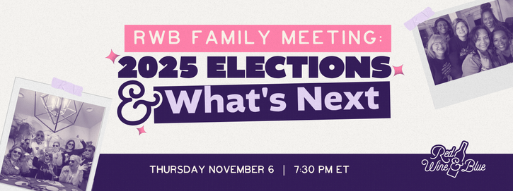"It’s time to come together and celebrate all the hard work you put in this election season! Join together with other members of the RWB community at our annual Family Meeting. This will be the time to catch our breath, reflect on the 2025 elections, celebrate the wins, and talk about what we’ve learned and where we’re headed next.