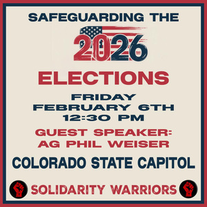 On Friday, February 6, Solidarity Warriors, fellow Indivisible groups, and grassroots allies will gather at the Colorado State Capitol to deliver a powerful letter calling for strong, immediate action to safeguard the 2026 midterm elections. The letter urges Governor Jared Polis, Attorney General Phil Weiser, and Secretary of State Jena Griswold to exercise their authority to protect election integrity, voter access, and democratic norms in the face of growing federal overreach and intimidation.