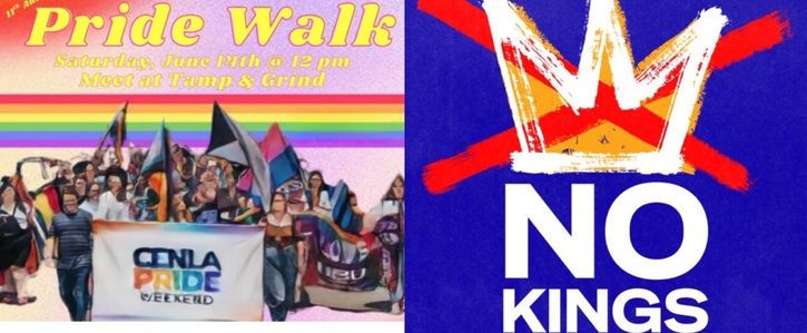 2. The CENLA PRIDE walk. 12:00PM. Meet near Tamp & Grind Coffee to walk through downtown Alexandria with signs and banners. Sign making happening the night before - 6:00PM at the Riverfront Center. Visit CENLA PRIDE on Facebook for details: https://www.facebook.com/CENLACLASSPRIDE .