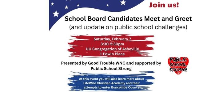 Join us at our February meeting and meet the school board candidates! All who have filed to run for either reelection or first time to the Buncombe County and Asheville City school boards have been invited to be there. This is your chance to meet them, hear why they are running and discuss the challenges they are facing and how they propose to meet those challenges. Also at this meeting, you will hear more about Lifewise Christian Academy. We know many of you have questions about this organization that is attempting to enter Buncombe County's public schools with off-site instruction during the school day for conservative Christian education. Come find out more about it...you'll be glad you did.