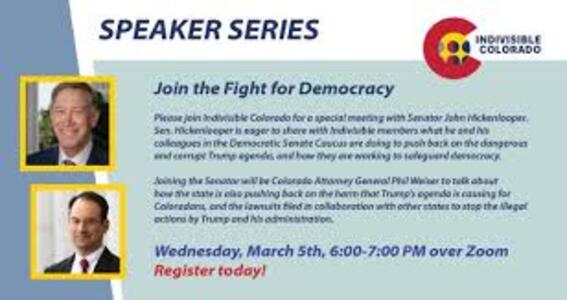 Join ICAN for this webinar by Senator John Hickenlooper and AG Phil Weiser on how we can fight back against the authoritarian regime. Questions will be asked to the Senator and AG from the hundreds of pre-submitted questions from registrants we have already received. We are not accepting additional questions at this time. There will be an opportunity to write your questions in the Q&A chat during the webinar.