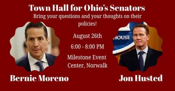 Bernie Moreno and John Husted have been cordially invited to join the community for a Town Hall on August 26th in Norwalk, Ohio. Before they return to D.C., we want to be able to talk to our Ohio Senators and share our concerns and ask questions. There will be advocacy groups and community speakers. Join us for this informative and interesting evening and let's hold our legislators accountable.