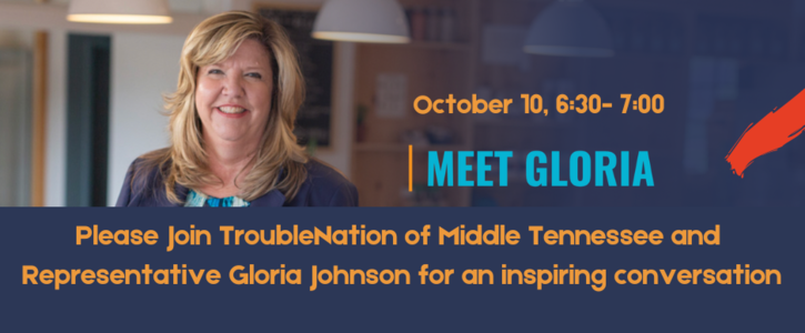 We have a very special event coming up - Please Join TroubleNation of Middle Tennessee and Representative Gloria Johnson for a candid discussion about her platform, the status of the Senate race, and how we can help get her to Washington.