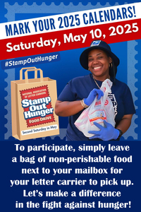 Just leave non-perishable food donations in a bag by your mailbox Saturday, May 10, 2025, and your letter carrier will do the rest. With your help, letter carriers and the U.S. Postal Service have collected over 1.9 billion pounds of food in the United States over the 30 plus years as a national food drive. Please help us in our fight to Stamp Out Hunger.