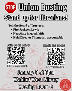 In March 2025, librarians in Charles County voted to unionize with the UFCW local 1994. Library Director Kenneth Wayne Thompson has since cut library services and set aside $250,000 of taxpayer money to hire Jackson Lewis - a law firm whose business model is preventing union contracts - for negotiations. The librarians still do not have a contract and are being subject to harassment and discrimination.