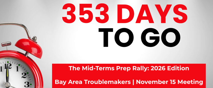 The 2026 midterms may still be 353 days away from November 15, but we can’t waste a single day! Join Bay Area Troublemakers for our November meeting, The Mid-Term Prep Rally, on Saturday, November 15 at 12:30 p.m.