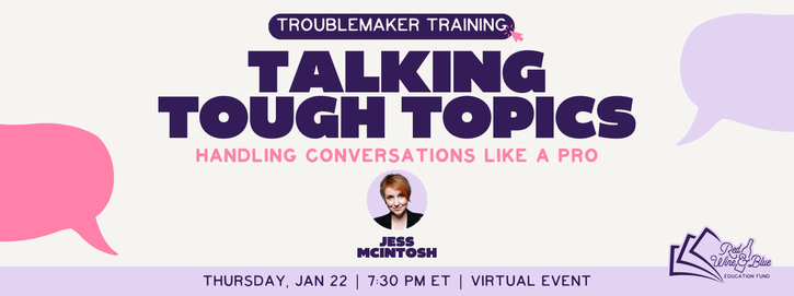 "With so much happening in politics right now our voices matter more than ever. Misinformation is everywhere and it is important that we know how to share accurate information, stand up for our values, and engage in conversations that make an impact. Want a little help having effective and persuasive conversations? We got you! Join us to hear from communications expert Jess McIntosh who will give us practical strategies to navigate political talk like a pro. Let’s create change—one conversation at a time!"
