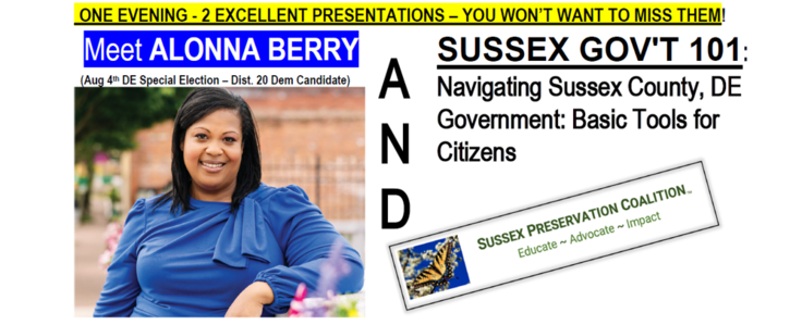 THIS Wed (7/16), Meet Alonna Berry (20th Dist. Dem Candidate- 8/5 Special Election) PLUS Sussex Gov't 101
