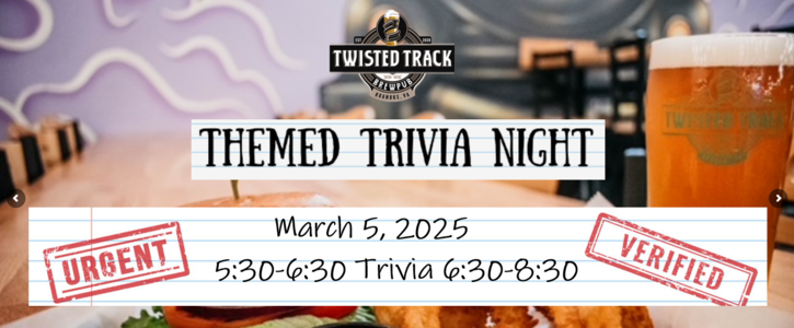 We are holding our next social event at Twisted Track Brewery on Wednesday March 5, 2025.