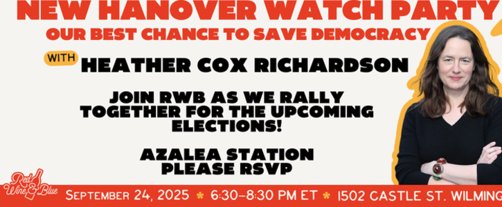 Join RWB and area troublemakers as we Rally Together to watch Our Best Chance to Save Democracy w/ Heather Cox Richardson at Azalea Station on Wednesday, Sept 24 @ 6:30PM. Learn the most effective way to impact local elections and fight extremism in your community. RWB will provide a light dinner; drinks will be available for purchase. Please download the Red Wine and Blue app from your app store before the event. RSVP for "New Hanover Watch Party w/ Heather Cox Richardson on 9/24 with NC Red Wine & Blue! See you there!